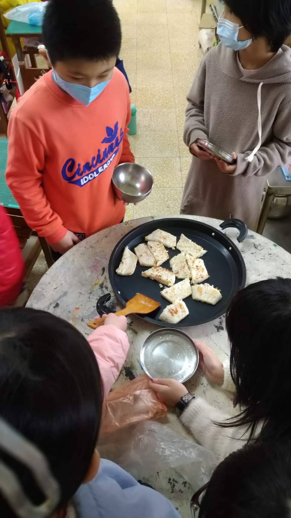 學校推動蘿蔔種植課程,從一開始的除草翻土、播種施肥、汰蕪存菁,採收,紀錄蘿蔔的成長過程。收成後計算蘿蔔的數量,去皮、刨絲、切配料、拌炒、調配在來米粉添加的比例、掌握蒸炊的時間,等冷卻後一塊塊白玉般的蘿蔔糕出爐了!最後由老師將切小塊的蘿蔔糕下鍋,煎製成香酥可口的蘿蔔糕。這美味的蘿蔔糕,是師生們享用自己收穫的成果。